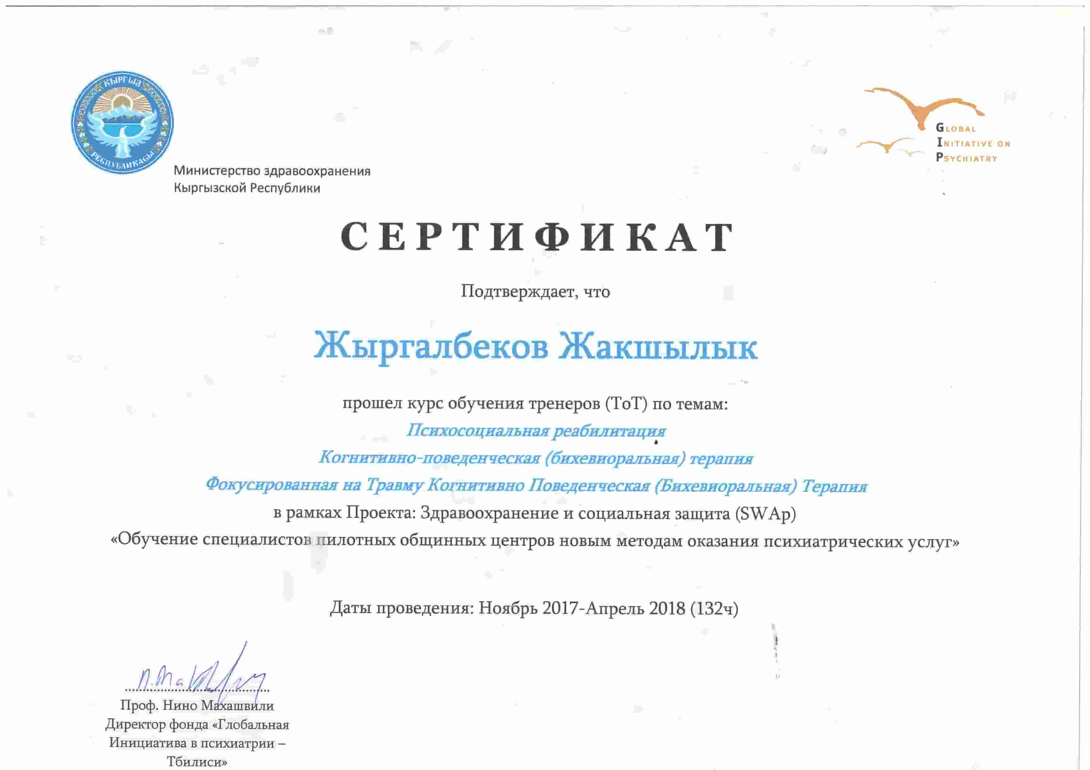 - Прошел курс обучения специалистов пилотных общинных центров новым методам оказание психиатрических услуг. (126 часов)