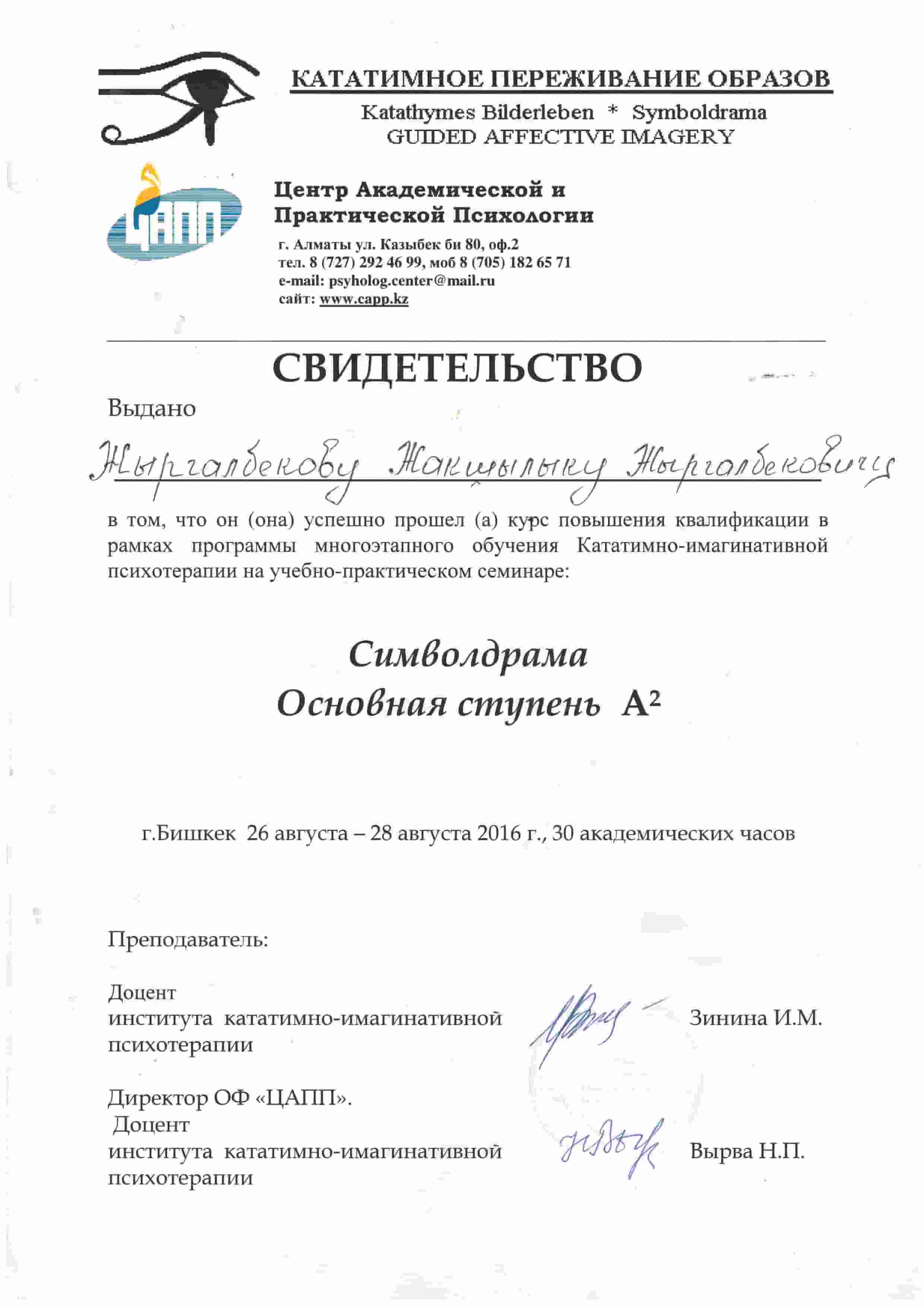 - Прошел курс обучения Катотимно-имагинативной психотерапии 60 часов, Центр академической и практической психологии.